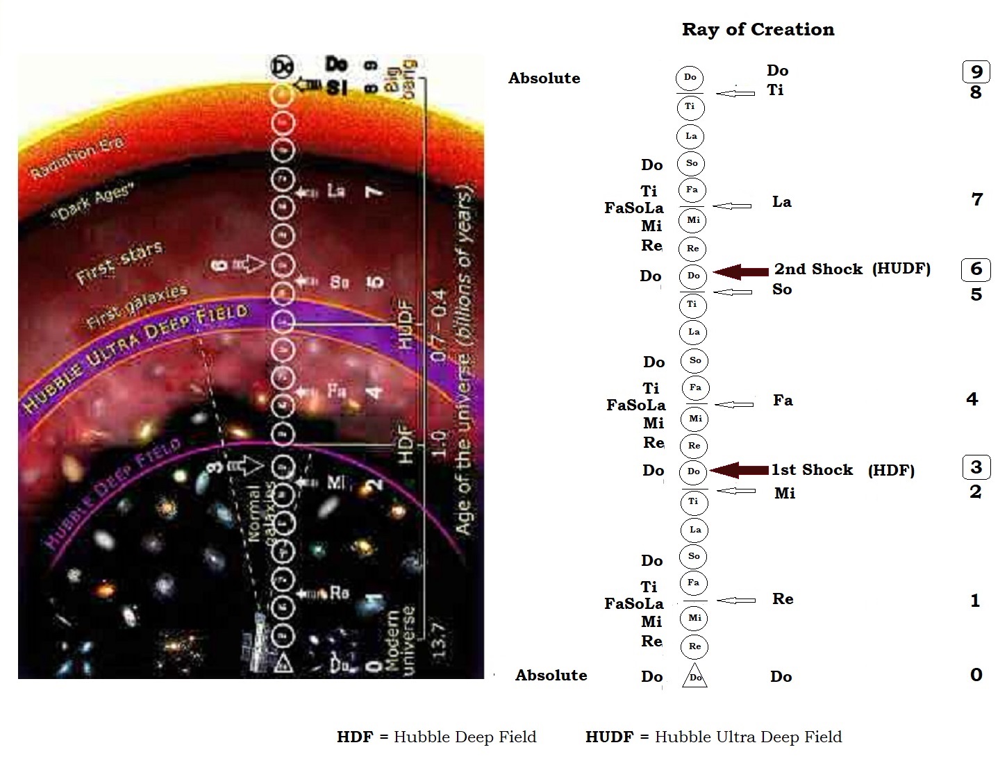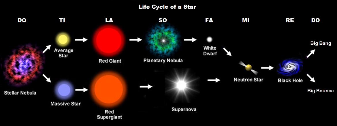 "We might proposed that Stellar Nebula is the 'DO' -stopinder or Sun-Absolute in the Life Cycle of Stars (or rather Suns) in a descending octave or on the way to dying; the Average Stars or Massive Stars varying in size/type are the TI-stopinders and further dying; the Red Giants or Red Supergiants varying in size/type are the LA-stopinders and further dying; the Planetary Nebula or Supernova varying in size/type and further dying are the SO-stopinders and further dying; the White Dwarfs still vary in size/type and further dying are the FA-stopinders; the Neutron Stars still vary in size/type and near to death are the MI-stopinders; the Black Hole dead but on a conduit of fragmentation of the quantum octaves in the 'Event Horizon' and transforming them in the 'Singularity' of completion is the RE-stopinder; and finally, from this 'Singularity' the 'DO'-stopinder of the next cosmic cycle begins with the emergence of a White Hole that would give rise to a new "Big Bang" or a "Bounce" with numerous "Small Bangs" and "Small Bounces that would follow subsequently."
