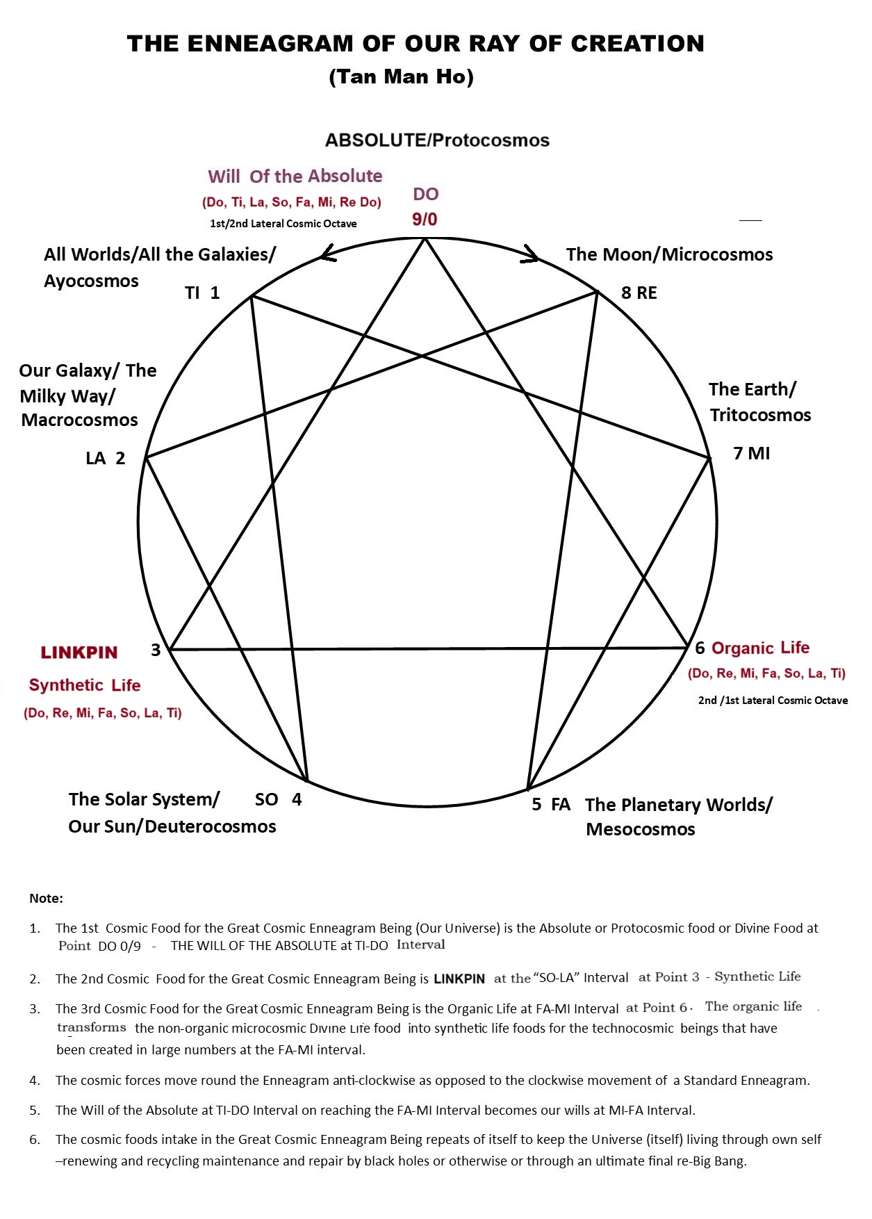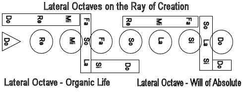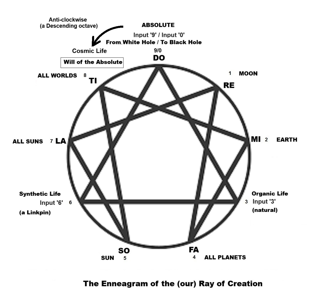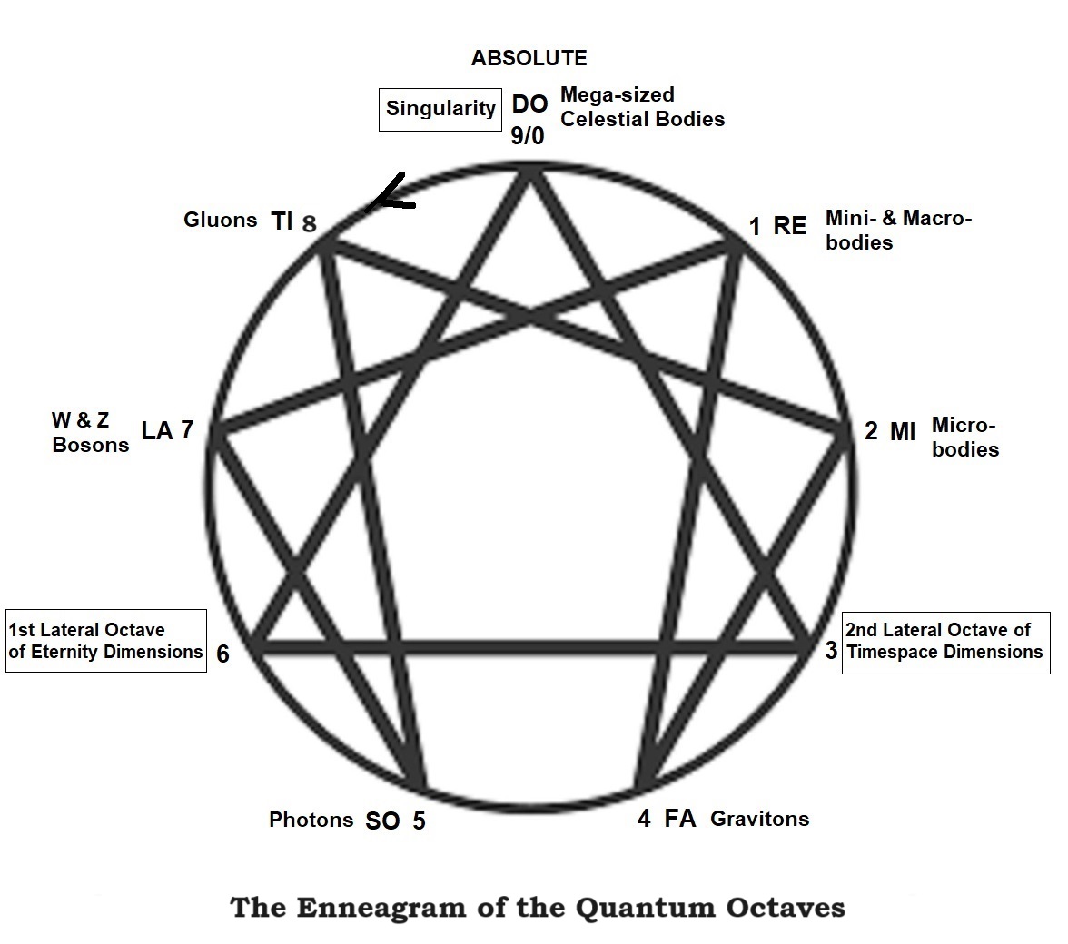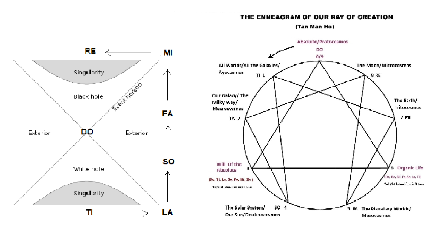Gurdjieff's cosmology is based on the model of a musical octave and has antecedents in the musical and geometric harmonies and proportions elucidated by the Greek philosopher Pythagoras and his followers, as is shown by the quotation from Plato's Republic given above. He is given credit for discovering that the interval of a diatonic, 7-tone scale is rooted in the ratio 2:1, that of the fifth in 3:2, that of the fourth in 4:3, and that of the whole tone in 9:8. Followers of Pythagoras applied these ratios to lengths of a string on an instrument called a canon, or monochord, and thereby were able to determine mathematically the intonation of an entire musical system. The Pythagoreans saw these ratios as governing forces in the cosmos as well as in sounds. Plato, in the Timaeus describes the soul of the world as structured according to these same musical ratios. Further connections to ancient Egypt and their Ennead of the gods may also be inferred since Pythagoras is said to have studied with the Egyptian priests. The Hermetic philosophers of the Middle Ages also drew heavily on the Pythagorean Music of the Spheres to formulate their models of the universe. The Divine Comedy written by the poet Dante Alighieri (1265 AD -1321 AD) is an allegorical narrative of the poet's imaginary journey, firstly, through hell and purgatory, guided by Virgil, a symbol of reason and subsequently, through the nine circles of heaven, guided by Beatrice, a symbol of the Mother Goddess. Hildegard von Bingen (1098-1179) described nine Ranks of Angels. Robert Flood, an Elizabethan Alchemist, also depicted the universe as a Divine Monochord. According to Gurdjieff, the Enneagram is a universal symbol by which all processes in the universe can be understood. As the universe unfolds from the Absolute and elaborates itself in the Ray of Creation, its complexity increases over Time as the various gradations of energy interact according to the Laws of Three and Seven. Beginning with the Absolute, the Law of Three manifests in its most simple form as the three fundamental forces in the universe, the Active, Passive and Neutral. At each step or note of the Ray of Creation the Law of Three multiplies and generates more interactions. The sequence of elaboration of laws given by Ouspensky follows a pattern of doubling at every level, that is, 1, 3, 6, 12, 24, 48, 96 ……. Likewise, every note of the octave of the Ray of Creation generates within it octaves of sub-harmonics, leading to the formation of galaxies, suns, planets, sub-atomic particles, atoms, molecules, compounds, cells, plants, animals, etc. Ouspensky used Hydrogen (H) to provide a 'qualitative' factor to these pure numbers 1, 3, 6, 12, 24, 48, 96 ...... We could also use Higgs (H) from the Standard Model of the Periodic Table of Elementary Particles (sub-atomic level) of our modern discovery to denote the same thing. What is important here is to remember that these numbers represent cosmic properties at the quantum level and beyond, that is, cosmobiological and cosmopsychological, cosmosociological and cosmotechnological or cosmodesignological levels. Note that this is about a single Ray of Creation or a branch Ray observed from our location at one of the MI-FA Intervals in all the Rays of Creation. This MI-FA Interval and its fillings come into existence on Earth at a certain stage of development of the (our) Sun family. This Sun is already a 3rd Order Sun among trillions of other 3rd Order Suns in all the rays of creation. This stage is a life cycle of the (our) Sun for which the MI-FA Interval on enables the Earth to be and remain a Mother Earth. When our Sun reaches the end of its life cycle, the MI-FA Interval of the (our) Ray of Creation disappears as our Sun no longer nourishes, maintains and repair it. It burns the Mother Earth and removes the MI-FA Interval. Thus all the Organic life and the Synthetic Life disappear or leave Mother Earth leaving a Dead Earth to be swallowed by our Sun's final stage of existence - the Black Hole which then becomes a very dense dominating graviton-center with a very powerful Quantum Force Field Carrier (graviton) that would swallow all of the planetary and lunar families with its control by gravitational curvature. Once this teleonomical role or purpose is achieved, the Black Hole enters the transitional singularity polar Absolute Below-Absolute Below, the recycling would begin through a possible White Hole elsewhere in the cosmic spiral. As to the 1st and 2nd Order Sun they have receded and become the "Microwave Background" in the mega-Black Hole afar of the Universe Being still with all the Particle-Wave-Psyche (PWP) triadic principles intact and potential octave-dynamics principles ready for a new "Big Bang" (after the completion of all the 3rd Order Suns' work in the universe), and the great emergence in the process of random-like cosmic psyche-reincarnating, cosmic life-reviving and wave-functioning and materialization (physicalization) in the numerous new branch rays of creation. Note that at the top of the (our) Ray of Creation is the note ‘DO’ of the Absolute Above (a soundless "Big Bang") and at the bottom ‘DO’ is another Absolute below (another soundless "Big Bang" to be), telling us that a new octave might come-into-being or a Cosmic Cycle is about to begin for this (our) Ray of Creation. Also our branch ray might be dying or “clashing” with the other approaching branch rays or “clashing” by the parts. "The Organic Life at the FA-MI Interval of the (our) descending Ray of Creation which began historically as organobiocosmic octave and ended as organobiosociotechnocosmic octave, that is, from pure Organic Life to a mix of Organic Life and AI/AGI Robotic Machine Life (Synthetic Life) at the "LA-SO Interval". The ascending biosociotechnocosmic stopinderation here at this MI-FA Interval has yet to encounter a biosociotehnocosmic stopinderation of aliens or alien civilizations from the trillions 