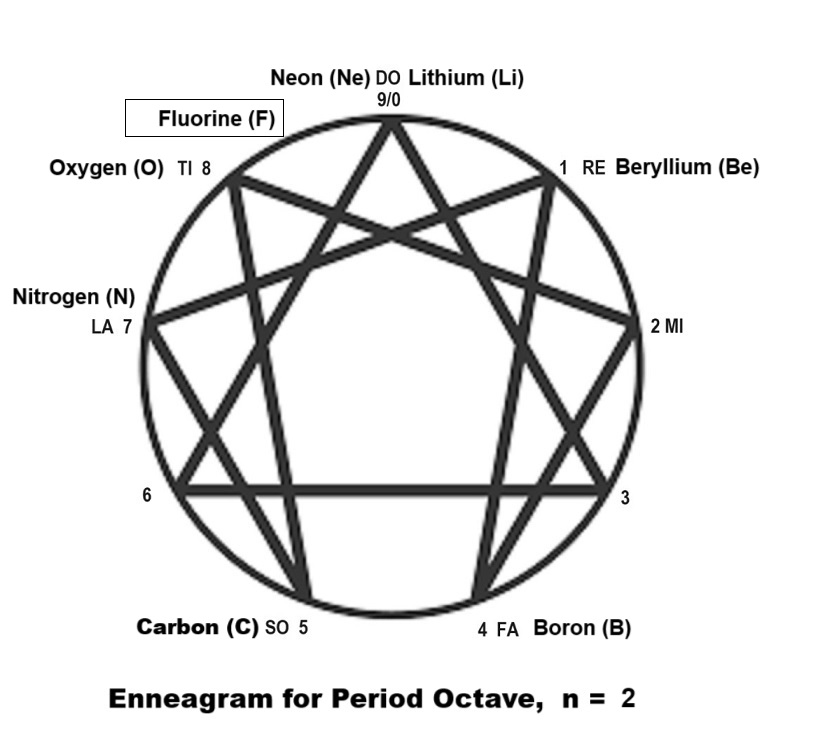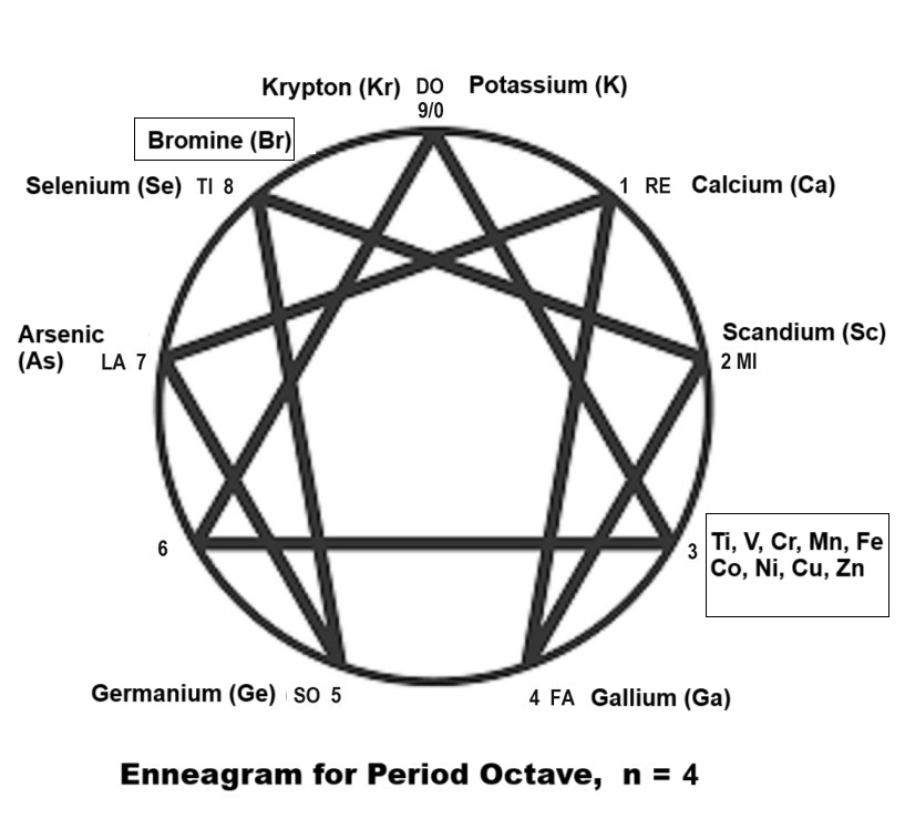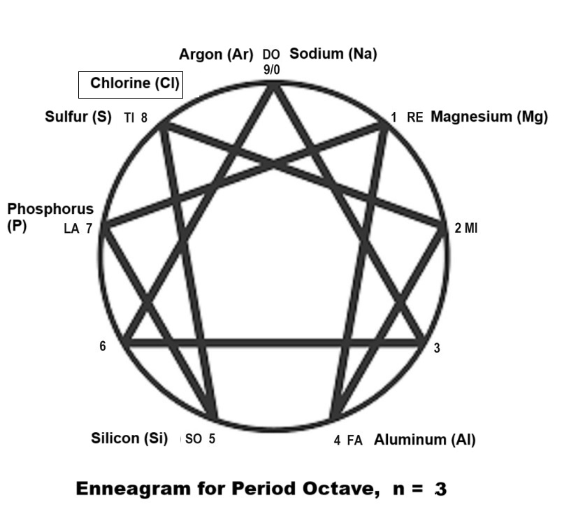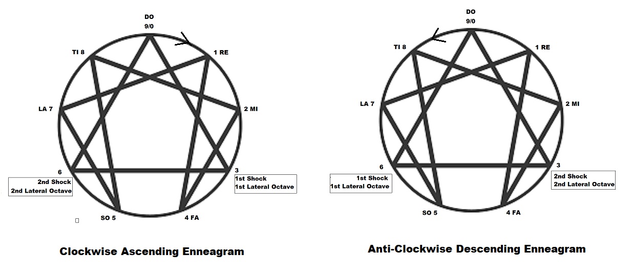 spooky. Another model notable in this body of work knowledge is the model of the 4 bodies and often with the constant reference to three structural gravity-centers such as Hethormen (head, thorax and abdomen) for biological beings, Laujinggong (Boss, manager and worker) for sociological beings, Padrigine (Passenger, Driver and Engine) for technological beings, The three plus (+) a physical or first body or a carriage make up a 4-bodied being and the psychic centers in them. The laws of octave is always accompanied with the two fundamental Pythagorean MI-FA Interval and the TI-DO Interval and 2 lateral octaves whether fully of partially evolved. The Enneagram is another way of presenting the same law of three and law of seven with mathematical ratiocination principle applied on 1 totality into the 7 notes, notably the 1/7 = 0.142857 142857 .... and always accompanied by the spooky "SO-LA Interval." This Enneagram model together with Periodic Table
