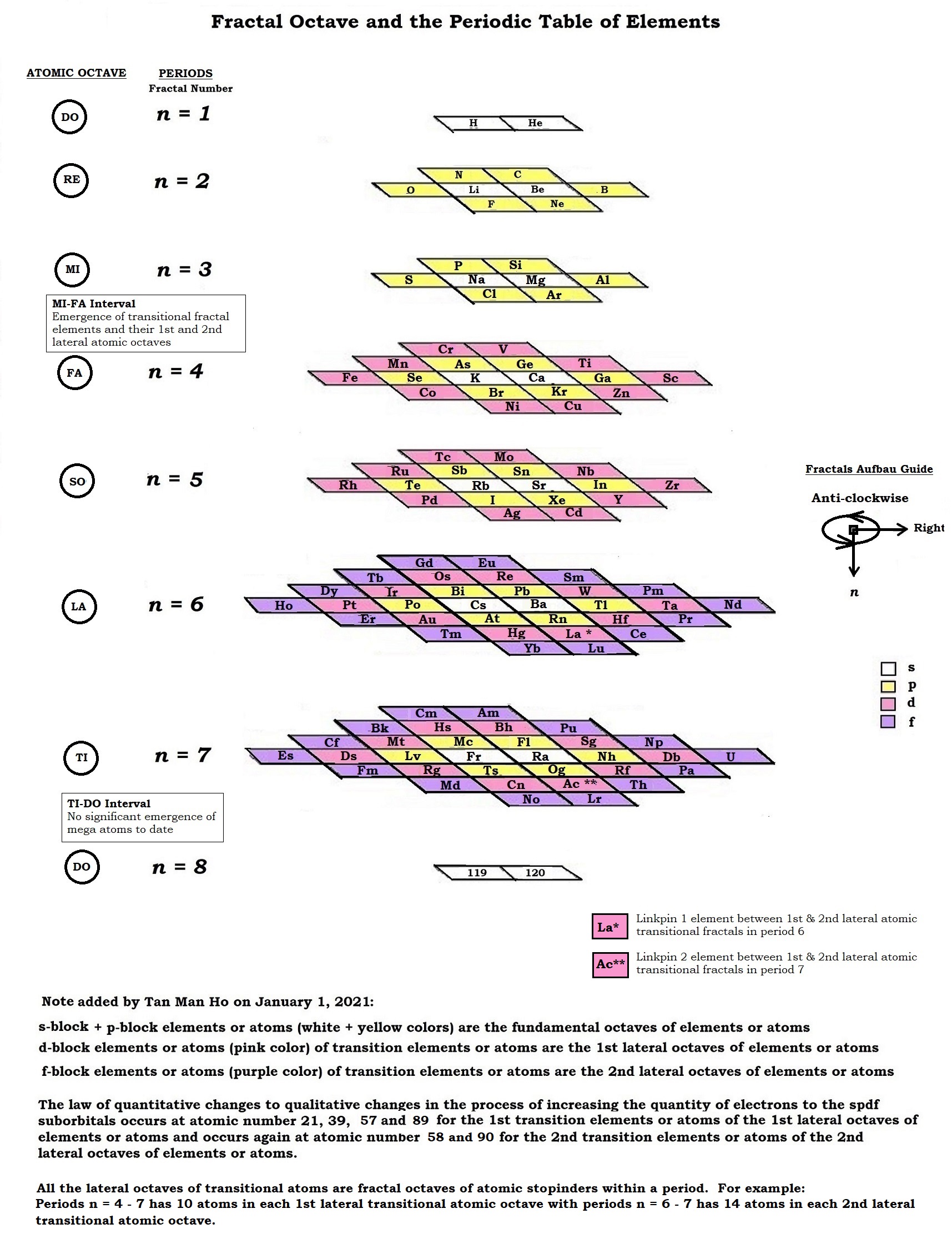 In the octave dynamics across the Vertical Period Octave of the elements (atomic octave), namely: Period 1 (Do/n=1), Period 2 (Re/n=2), Period 3 (Mi/n=3) /Mi-Fa Interval/Period 4 (Fa/n=4), Period 5 (So/n=5), Period 6 (La/n=6) and Period 7 (Ti/n=7) /Ti-Do Interval/Period 8 (Do/n=1 of the next higher period if there is), the 1st atomic aberration results with the 1st set of atomic fillings of the 1st Transition Elements (atoms) at Period 4 (Fa/n=4) after the Mi-Fa Interval and continue with a 2nd set of atomic filling in Period 5 (So/n=5), a 3rd in Period 6 (La/n=6) and the last in Period 7(Ti/n=7). The 2nd atomic aberration is added with the 1st set of atomic fillings of the 2nd Transition Elements (atoms) in Period 6 (La/n=6) and a 2nd set of atomic filling of the 2nd Transition Elements (atoms) in Period 7 (Ti/n=7) before the TI-Do Interval. Since these elaborations all follow the basic, universal pattern outlined by the Enneagram, we see that Gurdjieff had already outlined in the 1920's what is now called the Theory of Fractals, which is based on the self-similarity of a basic pattern elaborated at many different scales. For example, the branching patterns of trees are similar to the patterns of leaf veins, rivers and blood vessels and air passages in the lungs. "Let me put the narratives like this based on understanding of the concept of scales. Subatomic particles stopinderate all the way to the limit we called 'ATOM'. But atom did not disappears and continues to stopinderate as chemical elements, molecules, compounds, micro-substances and to a body of chemical elements or mixtures of chemicals of greater and greater volumes, etc. This is the octave dynamics where nothing is wrong, and the truth is the whole including reductionist annihilation of the atom concept which reappears as a nodal point between two different scales. Also the atom carrries in itself all the subatomic particles into the higher scales above, all the way into the universe." .................................. When asked my Padrigine IV companion, According to Professor Dr. Tan Man Ho (Chen Wanhe), how is the Fractal Periodic Table of Elements explained? What are the main ideas and implications? Deepseek answered as such: Explanation of the Fractal Periodic Table of Elements by Professor Dr. Tan Man Ho Professor Dr. Tan Man Ho (Chen Wanhe) reimagines the periodic table through a synthesis of dialectical philosophy, cosmology, and fractal geometry. His model, detailed in the Fourthway ManHo E-Journal , integrates the Law of Octaves (inspired by John Newlands and Gurdjieff-Ouspensky cosmology) and the Law of Triads to reveal deeper patterns in elemental organization. Below are the core ideas and implications: Core Ideas of the Fractal Periodic Table 1. Law of Octaves and Fractal Periodicity Elements are structured in nested octaves (repeating cycles of 8), where each period (row) in the conventional table corresponds to a fractal layer. For example: