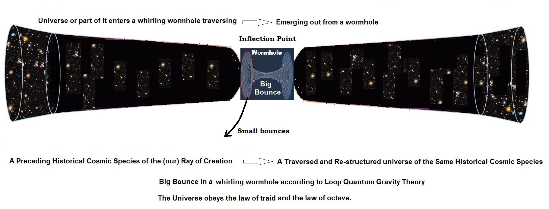 "For tri-octave dynamics Bagua enneagram perspective: From the Black Hole, the White Hole emerges and from the White Hole the Black Hole emerges, in between there is an Event Horizon where the world of triads, baguas, hexagrams and enneagrams are contracted to singularity in a Black Hole and expanded to the maximum after the White Hole. For the simple geometrical approach or the mechanical dynamics of the physical scientific perspective: Between the Black Hole and its Singularity and the White Hole and its Exterior lies the axis of the Event Horizon." The ABSOLUTE 'DO' (Above) meets the ABSOLUTE 'DO' (Below) is the SUPERBOUNCE of an inflection point! Universes with forms come and go, but when the Great Ray of Creation for which ours is only one of them dies, it is to be reborn by the SUPERBOUNCE of the inflection point. However, a spacecraft can be propelled by a man-made mini-blackhole in-front to enable spacecraft propulsion around the Evergreat Cosmic Enneagram using the law of falling very deep into this man-made mini-blackhole and superbouncing it away with control or just closing the mini-blackhole to free itself and leave.