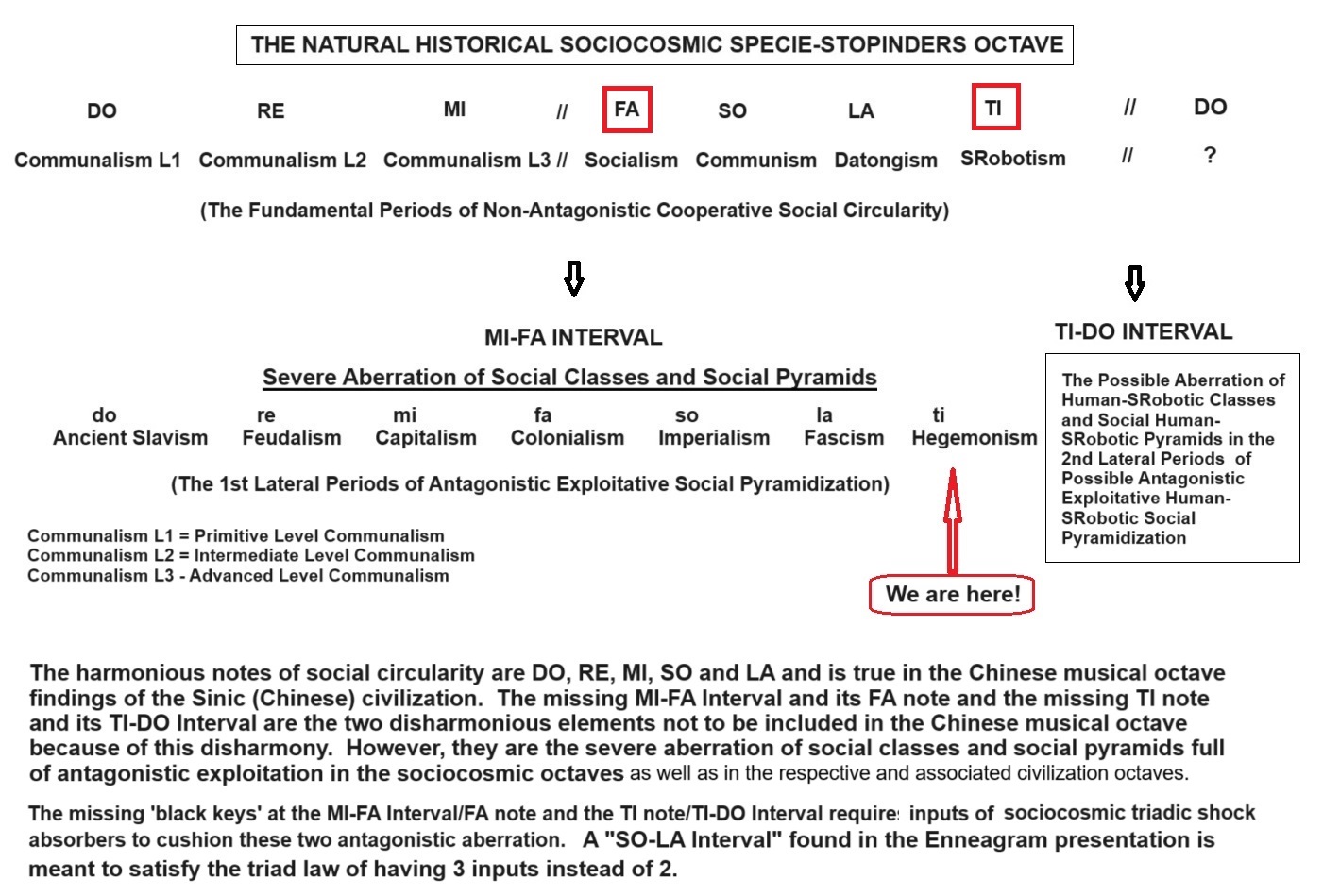 Tan Man Ho: "Neither can the beings in the MI-FA Interval microcosm be removed by the beings from the TI-DO Interval macrocosm nor can the beings in the TI-DO Interval macrocosm be removed by the beings of the MI-FA Interval microcosm; so would be for them in the sociocosmic octave, the civilizational octave, the technocosmic octave, the biocosmic octave, the geocosmic octave, the cosmic octave and all other octaves with the exception during the recycling period of chaotic fragmentation and reborn."