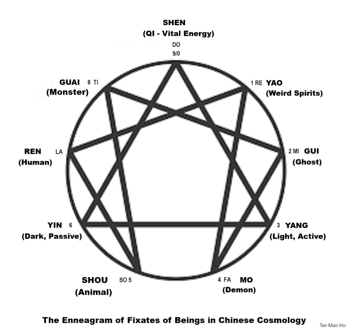 There are 7 main civilizations and numerous sub-specie civilizations derived from these 7 main civilizations that espouse varying understanding of noomakhia cosmologies of the same for which this research on noomakhia cosmology is just one of them. The full spectrum of noomakhia cosmologies can be found in the real noosphere (NOO) as it is of the current still existing in the real world as actually existing C-influences in function and operation and/or with its past archeological and archeosophical B-influences of the relics: 1) The Eastern collective four-bodied NOO-PESTLES(+)-PDCE Carriage of civilization being (Sinic, Buddhist, Daoist, Tibetan, Hindu civilizations) 2) The Western collective four-bodied NOO-PESTLES(+)-PDCE Carriage of civilization being (Anglo-Atlantic, Greek, Western European civilizations) 3) The Northern collective four-bodied NOO-PESTLES(+)-PDCE Carriage of civilization being (Slavic, Kievan, Scandinavian, Orthodox, Eastern European civilizations) 4) The Middle-Eastern/Central Asia collective four-bodied NOO-PESTLES(+)-PDCE Carriage of civilization being (Islamic, Mesopotamia, Babylonian, Zoroastrian, Iranian civilizations) 5) The South Asia collective four-bodied NOO-PESTLES(+)-PDCE Carriage of civilization being (Indic, Vedic, Akhand Bharat civilizations) 6) The Latin America collective four-bodied NOO-PESTLES(+)-PDCE Carriage of civilization being (Olmecs, Maya, Aztecs civilizations) 7) The African collective four-bodied NOO-PESTLES(+)-PDCE Carriage of civilization being (Ancient Egypt, D'mt (Ethiopia), Aksumite (Ethopia) civilizations) Collectively, they would be able to provide us with a bigger spectrum of knowledge and understanding of these Earth civilization's cosmological teachings - existing and archaeological (past). The cosmic secrets discussed here is closely linked to the Gurdjieff-Ouspensky cosmology, which is more of a presentation of a unique cosmological teaching that arises from an attempt to integrate and understand all the essential cosmological teachings from all the 7 main Earth civilizations (Civilization Enneagram) - and presented in its own unique manner, and in its own Wittgenstein language captivity based on the law of triad and the law of octave in association with all the basic laws of Marxian dialectical materialism, and numerous other laws. It is an application of the laws used to derived a new emerging knowledge and understanding of 'All and Everything' and to enable a broad-based cosmological resolution to a new general cosmological outcome with all its content as a new involving and evolving common-denomination seed for the common sharing-destiny and future direction of Humanity-at-Large or for all the main Earth civilizations as one - all within this Wittgenstein language captivity. 3. The Enneagram of Beings in Sinic (Chinese) Cosmology The noomakhian logos in Sinic (Chinese) Cosmology in classifying beings is deeply intertwined with philosophical concept of 'Qi' (vital energy) and Yin-Yang polarity and moral/ethical cosmology as observed in classical texts, folklore and modern interpretations - in the collective four-bodied NOO-PESTLES(+)-PDCE Carriage of the Sinic (Chinese) civilization. However, such Passenger Body No. 4 of this four-bodied Sinic (Chinese) civilization might here be enneagramic associated with an Enneagram of Fixates of Beings for the Chinese cosmology, as show below:
