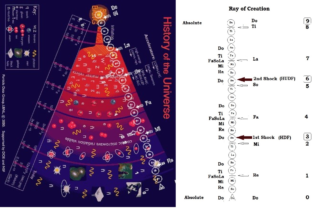 The gravitino stopinders with their quantitative different masses together with the force carrier gravitational field obey the Pythagorean Monochord Harmonic Scale, and through its law of octave produce an inner octave of primordial gravity-centers Do, Ti, La, So, Fa, Mi, Re and Do for the gravitino stopinders of this Period 5 of the fundamental quantum octaves. Upon the collection of more and more masses in the form of descending octave of particles, atoms, compounds, micro-bodies, mini- and macro-bodies and the super mega-celestial bodies, these cosmic stopinders gradually make their way into the lower fundamental cosmic stopinders (MI, RE and DO) enter into the range of our visible universe in form of the (our) visible Ray of Creation with definite micro, mini, macro and super mega gravity-centers for which we can observe and study with our naked eyes and our technocosmic electron microscopes and telescopes. For those very small wave-particles, out of our visible range, we have developed technocosmic ways to discover, "observe" and predict their existence. Beyond the quantum world into the classical world of Newtonian Mechanics gravity is given the symbol of 'g'. The classical world of Newtonian Mechanics consists the world of Micro-bodies ('MI' of the fundamental octave of dimensions) such as the atoms, molecules, compounds, the mini-& macro-bodies ('RE' of the fundamental octave of dimensions) such as the physical bodies and objects found around man and the mega-sized celestial bodies ('DO' of the fundamental octave of dimensions) such the moons, planets, suns, solar systems and the galaxies). The mass of these huge physical bodies can increase indefinitely and limited only by the mass of the whole universe itself. This world is spatial (x-, y- and z- axes) dimensions significance with substantial distances amongst the physical bodies and time is one dimensional, irreversible and separated from space, and can objectively be given starting and ending point, timed, dated, month-ed and year-ed with set clocks and Calendars of various wenming civilizations. The objective time is NOT a real subjective time as it is but is simply objective connections of matter in motion, of events and activities through the parameters of objective time and space. All the timespace stopinders (Perpetual Changing, Point-ts, Line-ts1, Plane-ts2, Solid-ts3, mi-fa interval Time & Space Divide, Space-Z, Space-Y and Space-X) in the 2nd lateral quantum octave are objective time and space parameters and can often be contracted and expanded to fit in mathematical equations that would give satisfactory objectively measured results in scientific experiments. All eternity stopinders (Omnipresence-Omnivast Absolute, Eternal Unchanging, EPT or T4, EVS or S4, Cosmic Consciousness, mi-fa interval Cosmic-C & Bio-C Divide, and all the Bio-Cs in the 1st lateral quantum octave are also objective eternity time and space parameters - and with a non-computational value, and that is 'INFINITY' Ominpresence of time-to-be becoming Everpresence of Time (EPT or T4) and Omnivastness of space-to-be becoming Evervastness of Space (EVS or S4). Because man is a bio-conscious creature of the MI-FA Interval of the (our) Ray of Creation, he cannot feel and experience this 'INFINITY' except by extrapolation of time and space to what they should be in the something higher and above. However, the Bio consciousness (Bio-C) consists of the 4 stopinders (Delta brainwaves, Theta brainwaves, Alpha brainwaves and Beta brainwaves) or changing states of bio-consciousness at the Mi-Fa Interval of the 1st lateral quantum octave the eternity parameter where eternity is lost, and these "eternity" stopinders can be subjectively felt and experienced and becomes computational especially with frequencies and duration which can be measured objectively in relation to one state and another, among various human brains and the brains of other biocosmic species. However, subjective time itself or psychological time is noumenally felt and experience always in endless motion is uniquely subjective and independent to every moving bodies or rest bodies, in relative or "absolute" motion, physical or non-physical for which we can never know its source of arising and its ending and its vastness - they are everpresence and evervastness. From the Eternity, Omnipresence and Omnivastness Absolute arise the many Rays of Creation for which the (our) Ray of Creation or the (our) Universe is only one of them. All and Everything named by man are only the little part of this wholeness of the Eternitum! This include the named we give to this "Big Bang" purportedly narrated about this the (our) Ray of Creation and just for this ray of creation as observed by this type of man called the Homo sapiens some already become Homo sapiens (sapiens), and from this MI-FA Interval of the (our) Ray of Creation. For Eternity dimensions, I proposed that Omnipresence-Omnivast Absolute, Eternal Unchanging, the Everpresence of time (EPT or T4) and the Evervastness of Space (EVS or S4) and Cosmic consciousness (Cosmic-C) all of which have cosmic properties of presence, vastness, intelligence, psychicity, noosphere and the noumenon as massless 1st Lateral Quantum Octave (or inner octave). Connected to Cosmic consciousness is Bio consciousness (Bio-C) consisting of the Delta brainwaves (0 - 4 Hz), the Theta brainwaves (4 - 7 Hz), the Alpha brainwaves (7 - 13 Hz) and the Beta brainwaves (13 - 40 Hz)] which are not eternal or immortal in essence even though placed in the eternity continuum - die with the death of the brains. We can have Quantum Eternity as Period 6 of the 1st Lateral Quantum Octave - eternity above and temporal below. For Timespace dimensions, I proposed that Perpetual Changing, Point-timespace (Point-ts), Line-timespace (Line-ts1), Plane-timespace (Plane-ts2), Solid-timespace (Solid-ts3), mi-fa interval Time & Space Divide, Space-Z, Space-Y and Space-Z with temporal and spatial objective