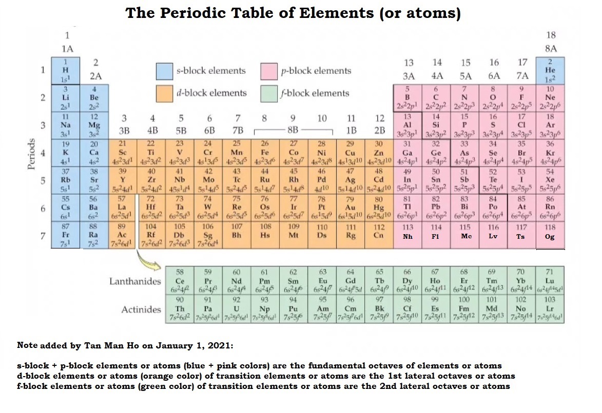 .......................................................... The Periodic Table of Elements consists of the fundamental octave of elements with 2 intervals at Mi-Fa and Ti-Do for each of the fundament octave of elements where Transition Elements are the 1st level inner lateral octaves and the Lanthanides and the Actinides are the 2nd level lateral octaves of elements. In order not to confuse the matter, it will be necessary to analyze this periodic table of elements (of atoms) from a Vertical Period Octave of the periods (n = 1 through n = 8) as well as a Horizontal Group Octave of the chemical groups (1A to 2A via the 1st Transition Elements of 3B to 8B and back to 1B to 2B groups) which is of very aberrating chemical nature rich in chemical property variants but still can be grouped at Mi-Fa Interval from the perspective of the Horizontal Group Octave with one group at the Ti-Do Interval. Again upon examining the Vertical Periods Octave this 1st Transition Elements of the Horizontal Groups Octave has within it a inner 2nd Transition Elements occurring at the "So-La Interval" (the Lanthanides) and the Ti-Do Interval (the Actinides) of the Vertical Periods Octave. The periodic table of elements showing spdf sub-orbitals and the s, p, d and f blocks of elements which are the essentially the inner octaves (Transition Elements) and inner inner octaves (Lanthanides and the Actinides) all at the MI-FA Intervals of the Fundamental Octaves of Elements innerly linked to the "So-La" and TI-DO Interval. As to the TI-DO Intervals there is a ‘Filling-Full-Stop” or a closure to the filling of the sub-orbitals resulting in stable elements terminating the quantitative filling changes of the electrons and enabling qualitative leaps into stable elements of each of the 7 fundamental octaves of the elements, namely into He (1s2 ), Ne ( 2s2 2p6 ), Ar (3s2 3p6 ), Kr (4s2 4p6 ), Xe (5s2 5p6 ), Rn (6s2 6p6 ) and Og 118. This 7th fundamental octave (n = 7) of elements was later complete when Nihonium (Nh 113), Flerovium (Fl 114), Moscovium (Mc 115), Livermorium (Lv 116), Tennessine (Ts 117) and Oganesson (Og 118) which were previously unknown except for Francium (Fr 87) and Radium (Ra 88) were discovered. As to the 2 unknown elements or atoms 119 and 120 of the 8th fundamental octave of elements or atoms (n = 8), we have not yet found them - they might be found in the moons or other planets if still could not be produced or found on Earth. (Tan Man Ho)
