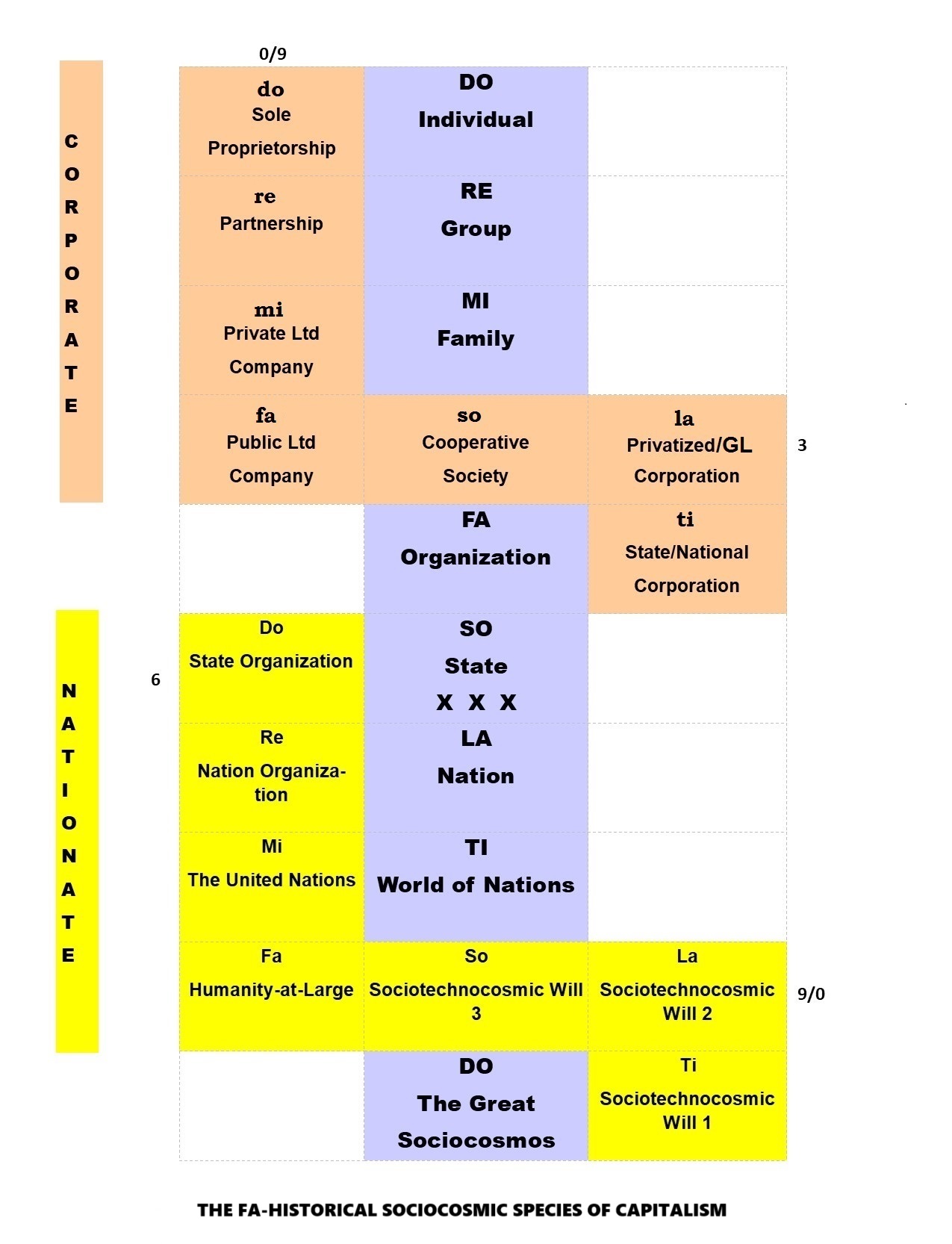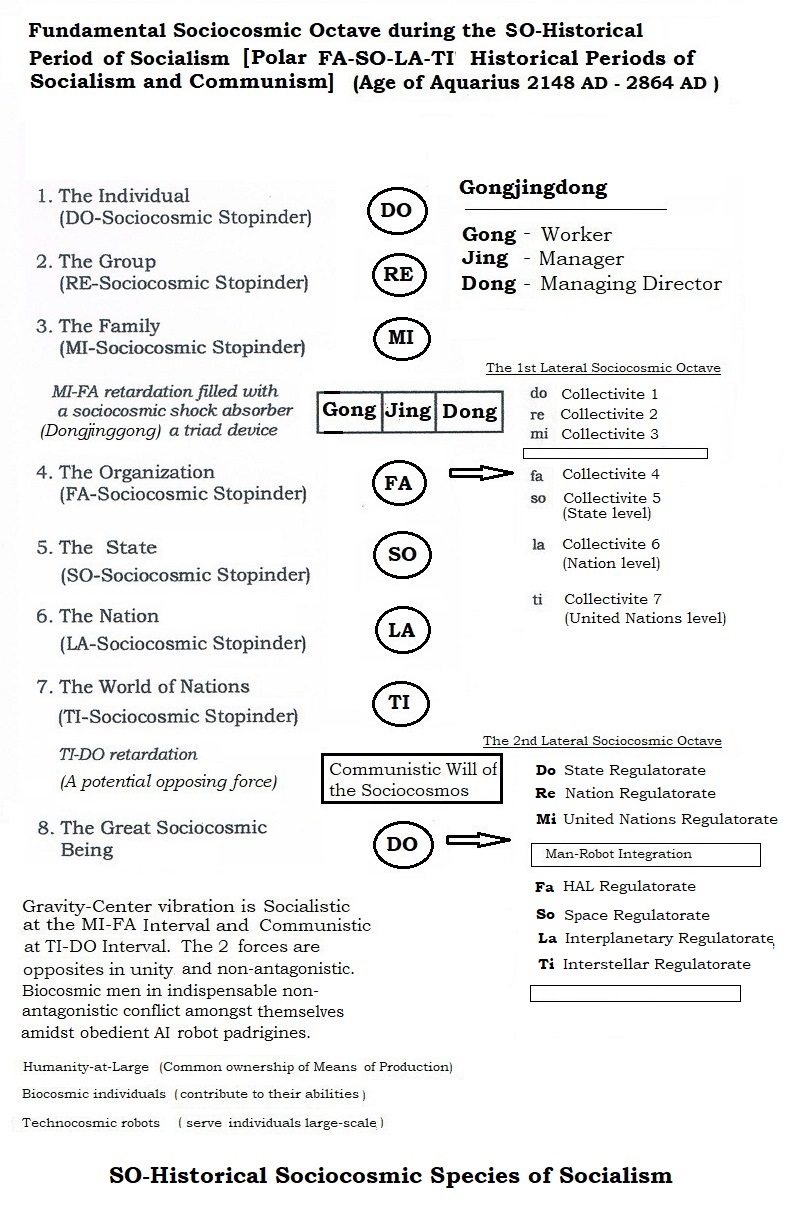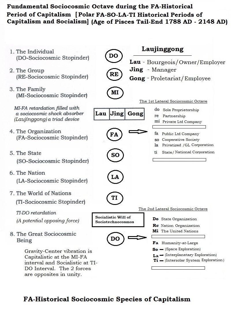 2   Inside the FA-Historical Sociocosmic Species of Capitalism, there are 7 concentric levels of the sociocosmic octave specific, four of which have a four-bodied laujinggong carriage configuration, namely: the FA-Laujinggong Carriage, the SO-Laujinggong Carriage, the LA-Laujinggong Carriage and the TI-Laujinggong Carriage.  The FA-Laujinggong Carriages houses all the 7 possible Corporate Production-Distribution-Consumption-Exchange (PDCE) Systems and the three higher levels of concentric SO-, LA- and TI-Laujinggong Carriages house the mainstream fundamental Regulatorate Systems.  As to the three lower levels of concentric DO-, RE- and MI-diadic carriages of this sociocosmic octave specific, there are no laujinggong carriages but with a three-brained hethormen human being of a socially stopinderable DO-Individual, a worm-like diadic leader-follower body of the RE-Group and semi-diadic/triadic Parents-Children household body of the MI-Family.  Between the MI-Family and the FA-Organization, there is a MI-FA Interval filled with laujinggong carriages of the PDCE corporates; above this interval are the continuity of the mainstream fundamental regulatory laujinggong carriages, and at the "SO-LA Interval" it is linkpin-welded/filled with the possible 7 laujinggong carriages of the nationates right up into the TI-DO Interval and beyond, and at the TI-DO Interval an infantile Sociocosmic Will of the antagonistic infantile essences of bickering evolutionary dongjinggong carriages and battling revolutionary gongjinglau and gongjingdong carriages in ascend-descend oscillation due to the power of an emerging SO-Historical Sociocosmic Species of Socialism. The outcome is a mystifying sociocosmic phenomenon typical of an aberrating polar FA-SO-LA-TI Historical Periods of Capitalism and Socialism - of two antagonistic individualistic and collectivistic forces on the NOO-Superstructure-Base Carriage of a historical sociocosmic species which in turn is housed in one or more of the collective four-bodied NOO-PESTLES(+)-PDCE Carriages of civilization of the One Earth Civilization.