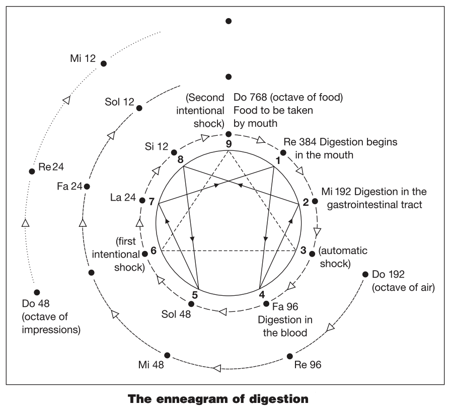 feelings - clairvoyance, conscious love, bliss, etc. DO 6 : The fuels of higher instinctive, moving and sex functions or potentials of a new biological species through the Law of the Trialectics of Ovum and Sperm and is able to influence and enter into the higher thinking and higher feeling centers. Otherwise, in normal non-revolutionary physical transformation a newborn baby is reproduced in replicate. Shocks analysis at Retardation points: For ordinary food octave: 1. Shock received at mi 192 to become fa 96 and ends at ti 12 Mechano-Coinciding-Mdnel-In (Gurdjieff) or