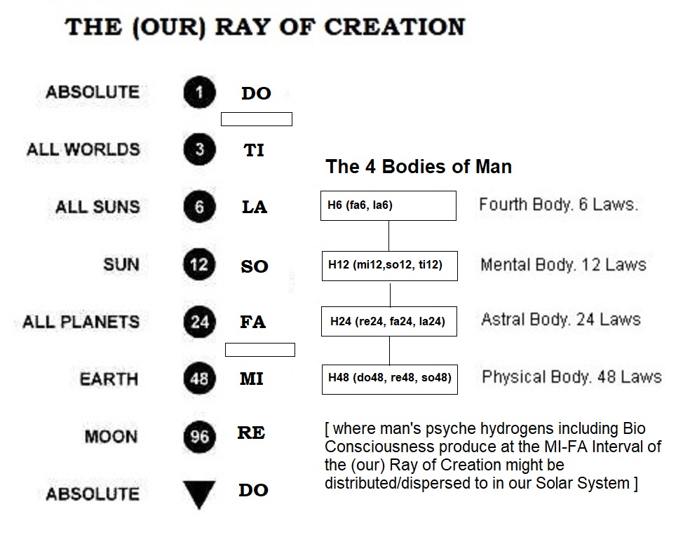 However, 'Consciousness-Eternity-Time-Space' Continuum which is an octave itself and is the essence, the inner phenoumenal core inseparable from the phenomenal physical appearances or coatings which we can observed. The numbers show the number of laws which each cosmic concentration is subjected to, the smaller the number of laws the greater is the degree of freedom.