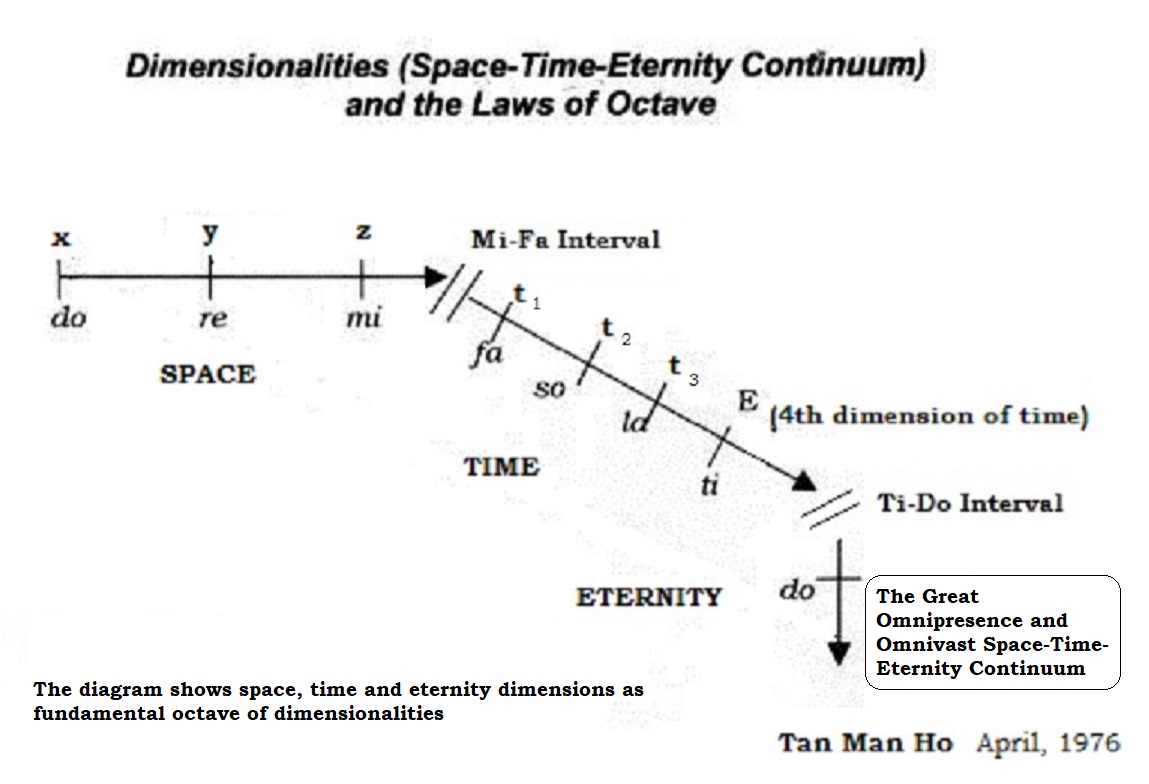 4 (Old version, 1976) The octave of dimensionality begins from Do and ends at Ti. Our reflecting apparatus on space and time is as such that space and time, although they are both dimension entities, could not be integrated properly. Besides space and time, eternity, which is also a dimension stopinder could not be integrated properly into the continuum. By treating the whole continuum as a dimension octave, the whole concept can be put together. This is because there are two disturbing retardation points in the octave model in general where two shocks could be allowed into the continuum ‑ one at mi-fa and another one at ti-do. The union of space, time and eternity, I propose, should be shocked with time at the Mi-Fa Interval to produce the space-time continuum and the union of space-time continuum should be shocked with eternity at the Ti-Do Interval to produce the Great Omnipresent Space-Time-Eternity Continuum ‑ the complete octave of all dimensions. These are necessary because of the nature and behavior or the laws peculiar to the formation or psyche hydrogens or consciousness formed, filled and deposited at this much constrained, unfortunate MI-FA Interval of the (our) Ray of Creations amongst trillions of other rays of creation in our universe or other universes if there are.