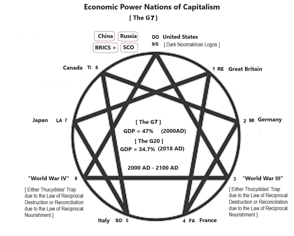 This Finance capitalism metamorphosis (Coachman Body No. 3) is able to destroy Individuals (DO), Groups (RE), Families (MI), PDCE Organizations, States (SO), Nations (LA) and create landless, propertyless, proletariat class and subservient States (SO), subservient Nations (LA) and even weaker Nationblocs (TI) but not strong enough yet to destroy big Nations (LA) and Nationblocs (TI) completely. It destroys nations and nationblocs just by making them into new nation debt holders to the level of bankruptcy, completely dependent slave nations, and extracting all their, and extracting their last resources at the lowest price. It has only to divide the world into two new conflicting blocs - the finance imperialists and/or neo-colonialistic nationblocs (G7 with US Hegemony capitalism or Body No. 4) versus the Industrial socialists and/or Global South countries (BRICS+ with China Leadership socialism or Passenger Body No. 4). The risk of World War III and World War IV stays doom to UGGMBCC Class (1%) and/or Human-at-Large at the MI-FA Interval and the TI-DO Interval of this enneagram of Finance capitalism, where the US Dollar Hegemony of Finance Capitalism rules the world purely by printing monies and circulating them and enforcing acceptance through the military-industrial complex, the financial complex, the Soft powers and the science and technology superiority to extract all resources of the world. In this way all sociocosmic stopinders of the fundamental and the lateral sociocosmic octaves can be pissed off in favor of the Great Social Pyramid, as depicted in the dark Noomakhian Logo of the FA-Historical Sociocosmic Species of Capitalism.