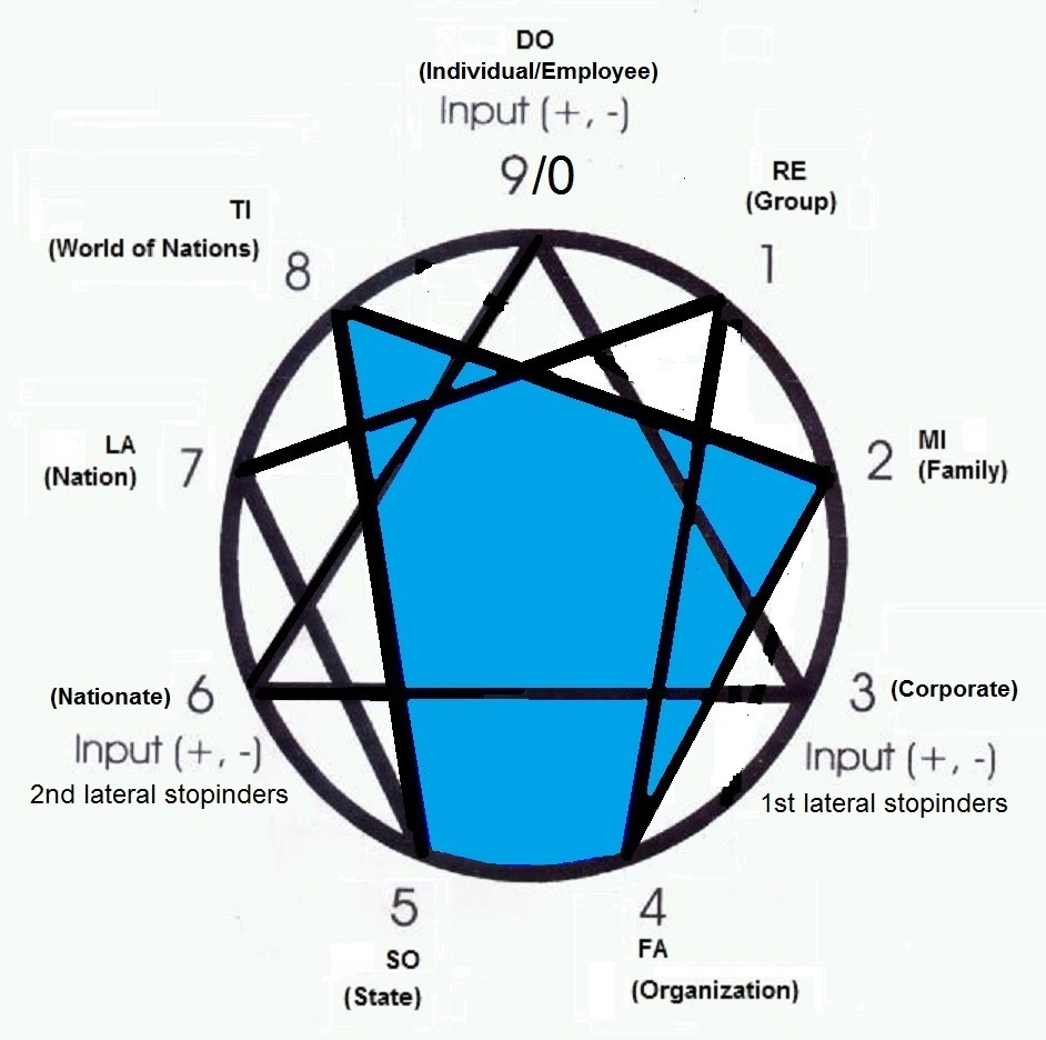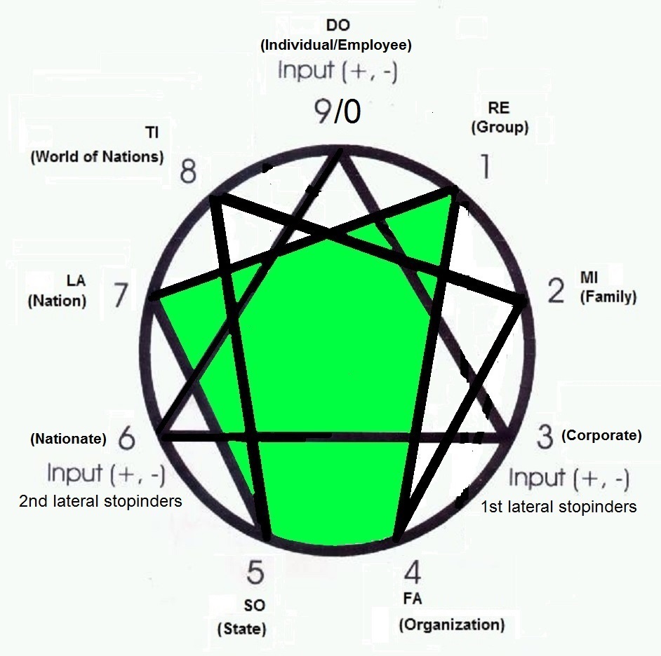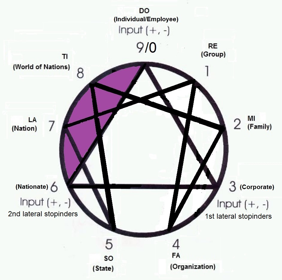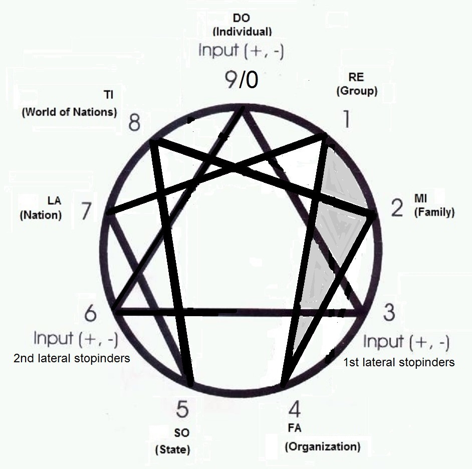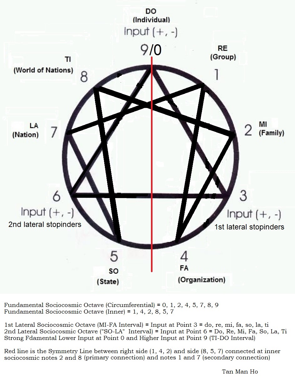 The sociocosmic enneagram is symmetrical along the red line with inner octave the RE-Group (1), the FA-Organization (4) and the MI-Family (2) on the right side of the symmetry often views as the lower order and the TI-‘World-of-Nations’ (8), the SO-State (5) and the LA-Nation (7) on the left side of the symmetry as the higher order. Both the right and the left sides are connected at DO-Individual (Inputs 0/9), RE-Group/LA-Nation (Points 1/7) and MI-Family/TI-‘World-of-Nations’ (Points (2/8). From the Chinese philosophy view, 国家 (Guo Jia) or ‘country’, an equivalent of the ‘World-of-Nations’ (TI) in this sociocosmic enneagramma is like a bigger, higher level and more powerful 家 (Jia) or Family (MI). So in the fundamental inner sociocosmic octave, stopinder MI-Family at Point 2 is immediately linked to stopinder TI-‘World-of-Nations’ at Point 8 in the internal movements of points 1, 4, 2, 8, 5, 7.