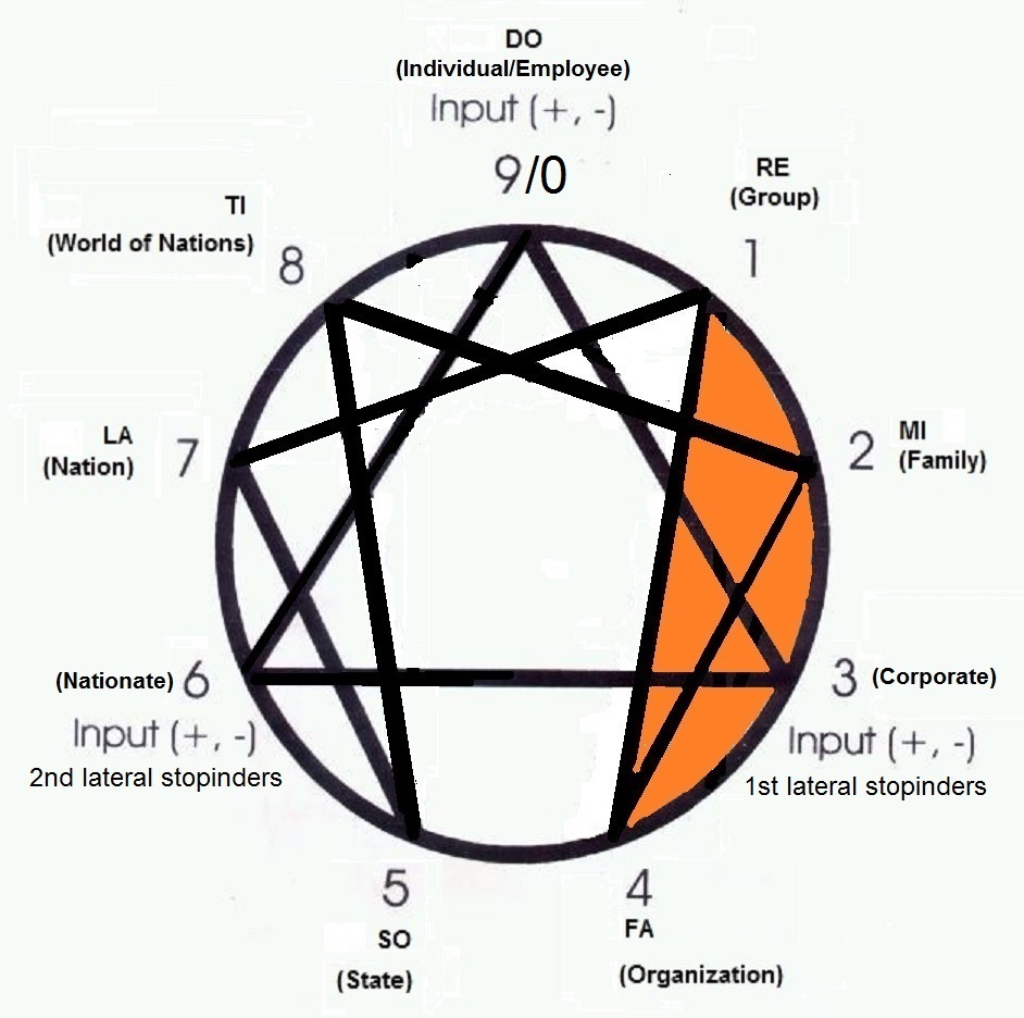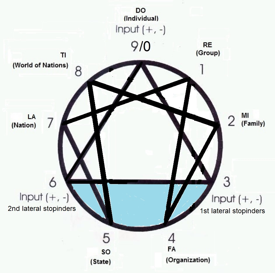 The social relations, the emanations and the influences of the sociocosmic stopinders are fundamental if the original flows are along the Fundamental Sociocosmic Octave (from the Individual (DO), the Group (RE), the Family (MI), the Organization (FA), the State (SO), the Nation (LA) and the World-of-Nations (TI) and if the original flows are along the inner fundamental octave according to the mathematical order 0.142857 ........ in repeating sequence of the six processes; are 1st lateral if the MI-FA Interval original flows are along the 1st Lateral Sociocosmic Octave within the 3-Inputs triad; is 2nd lateral if the TI-DO Interval original flows are along the 2nd Lateral Sociocosmic Octave within the same 3-Inputs triad. These are movement along the enneagram lines either ascending or as descending.