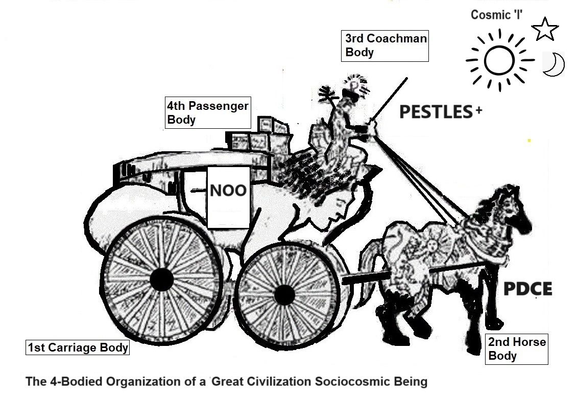 A. THE ROMANCE OF THE FOUR SOCIOCOSMIC BODIES IN BUSINESS ORGANIZATIONS 1 "When stationed in their great chariot, yoked to white horses, Krishna and Arjuna blew their celestial conches. Throughout the Hindu and Buddhist literatures, the chariot stands for the psychophysical vehicles. The steeds (horses) are the senses, the reins their controls, but the charioteer, the guide is the spirit on real self, (atman) Krsna, the charioteer is the spirit in us." (Radhakrishnan, The Bhagavadgita)