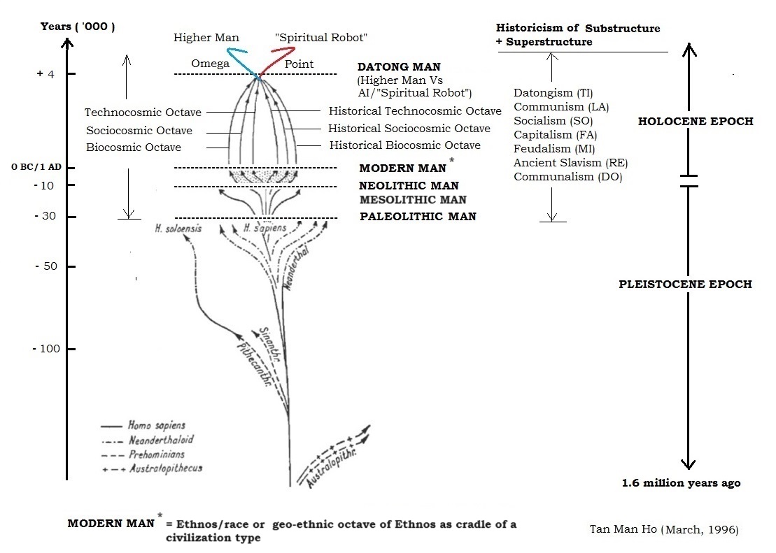 According to this remarkable being, the biocosmic octave (in contradistinction to the historical biocosmic octave) consists of seven great groups of radiation of the biocosmic stopinder beings during the Cambrian Explosion ('DO' of the historical biocosmic octave) where the Invertebrata octave and the Vertebrata octave has begun to separate biocosmically. The Vertebrata octave then consists of these 7 biocosmic stopinder radiations of biocosmic beings. The Vertebrata Octave is: 1. DO The Biocosmic Radiation of the Lancelets and Lampreys (primitive fish-like chordates) 2. RE The Biocosmic Radiation of the Fishes 3. MI The Biocosmic Radiation of the Amphibians A shock/transition toward land and sea-based beings at the MI-FA Interval 4. FA The Biocosmic Radiation of the Reptiles 5. SO The Biocosmic Radiation of the Birds 6. LA The Biocosmic Radiation of the Mammals 7. TI The Biocosmic Radiation of the Homo sapiens A second shock/transition producing Paleolithic, Mesolithic and Neolithic man, and the Modern Man at the TI-DO Interval 8. DO The Biocosmic Radiation of the Modern Man (to Datong Man); from Paleolithic, to Mesolithic, to Neolithic, to Homo sapiens, Homo sapiens sapiens, Homo geographicus and Homo cosmicus. Man is a Homo sapiens and a TI-stopinder being of the Vertebrata Octave; he became Paleolithic, Mesolithic and Neolithic, and might still be a cannibal especially on other tribes in the DO-Specie-Stopinder of Primitive Communalism (Communalism L1) in the Fundamental Natural Historical Sociocosmic Specie-Stopinder Octave. After becoming a social and civilizational modern man, a Homo sapiens, he no longer eats TI-stopinder level beings of his own species, but would continue to survive by eating all the LA, SO, FA, MI, RE and DO stopinders of the vertebrata octave in the food chain, all the way down to the Plantae stopinders (cereals, vegetables and fruits notably) of the Plantae octave, and finally a large amount of Water (FA), Air (SO) and Heat/Light (LA) from the geocosmic octave and even some minute traces of organic matters and minerals in it - as his three being-foods (solid/liquid food, air and impressions) according to the law of reciprocal feeding. As the modern social man no longer eats man, the eating process at the MI-FA Interval ABYSS of the Fundamental Natural Historical Sociocosmic Specie-Stopinders Ocatve, he becomes a Homo sapiens sapiens - knowing that he knows - and continues to eat the fruits of their labor or the products, services and work in the Production-Distribution-Consumption-Exchange (PDCE) moments through exploitation, slavery and oppression, social classes and social pyramidization structures or "cooking and eating methodologies" in the sociocosmic feeding process, which is actually a Reciprocal Feeding Law. Then he becomes Homo geographicus as his hunting grown expanded through geographical boundaries and to the Mother Earth's surface; then he becomes a Homo cosmicus seeking to explore space, planetary exploration in our Solar System and final interstellar exploration.