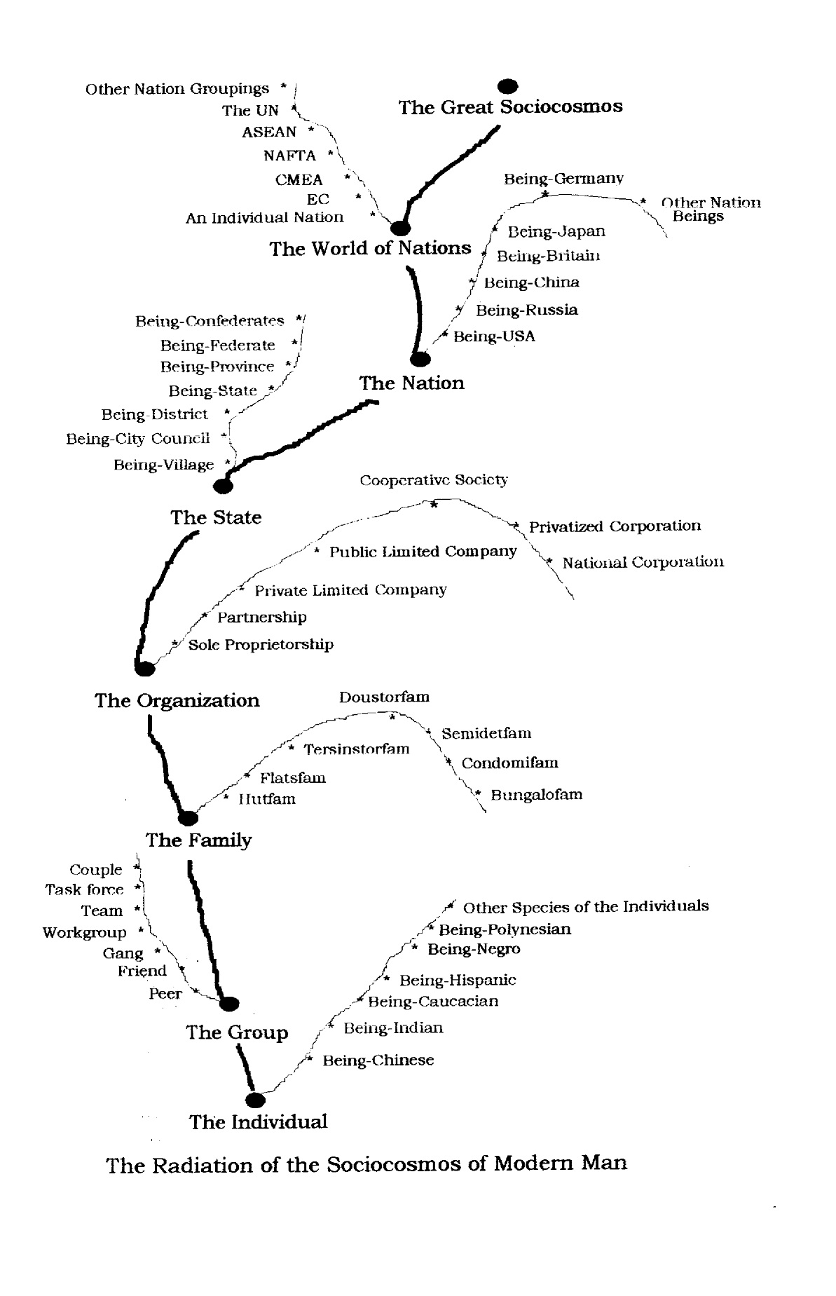 And these are the psychic octaves of the fourth dimension and belong to a different octave ‘parallel’ to the genetic octaves. They ‘wiseacre’ in the fourth dimension behind the physical genetic octaves. Now, the psychic octaves are approximately parallel to the genetic octaves and to the biocosmic octaves. The biocosmic octave is approximately parallel to the historical biocosmic octave. The sociocosmic octave is approximately parallel to the historical sociocosmic octave. The Sociocosmic Radiation of Modern Man is not a biocosmic radiation and it revolves round one biocosmic species known as Modern Man with its imminent inner race-stopinders. The sociocosmic octave generates the technocosmic octave and the resulting sociotechnocosmic octave in a triad dance. The biocosmic radiation of modern man or the individual is the various species of men known as races. Qualitative and quantitative variations of the inner biocosmic structure of modern man would still occur in respond to changes in the genetic and the environment factors respectively. The pressures from the fundamental and the lateral sociocosmic octaves together with that of the sociotechnocosmic octaves (which is created by our sociocosmic instinct) would place a work demand on these three-brained beings to the extent that their biocosmic content would gradually modify quantitatively (and even genetically) to cope with such pressures. Three-brained beings working in the various industries would gradually modify its seven inner stopinder octaves. Perhaps, after a few thousand years of conditioning, those working in the space industry would acquire features common to those creatures depicted in our current science fiction literature such as Star Trek, Space 1999, Star War and Star Peace. Those in the other industrial sectors would take on forms similar to the characters of our Brave New World (Aldous Huxley). Although the modern man is a biocosmic gravity-center vibration concentration at the TI-biocosmic octave based on the views of the remarkable being-Lehrman, this modern man is also the last biocosmic stopinder in the animalian octave. We can only expect small quantitative variation of features and simple changes in the primary inner stopinders in them such as the cell changes, the tissue changes and the organ changes, and also similar minor changes to their system octaves, but I must say, only quantitatively. Beyond this gravity-center vibration concentration is the octave retardation point (TI-DO retardation point), a highly resistant threshold for any possible evolution of a new species that seek to evolve from this foundation. Any new species emerging from the biocosmic inner progress through the man-octave would be a massive quantitative start of a new octave. We may imagine ultraman, superman, cybernetic being and the like for our next evolution but the biocosmic octave is unlikely to choose the terminal stopinder TI (modern man) for its point of departure. The biocosmic life force would go for other incomplete biocosmic octave in the tree of life. However, at the moment, modern man needs not become unduly worried about this choice of the biocosmic direction as possible creation of a higher species from the other biocosmic stopinders. Sociocosmically, the names of the DO-sociocosmic stopinder beings, as registered by the SO-sociocosmic stopinder are given by the parents. The sociocosmic radiation of the group consists of all the common interests, common purposes and common task forces derived out of the various combinations of the individuals. The sociocosmic radiation of the family consists of all outcomes from sexual trialectics of the male and the female individuals that could be registered (recognized) or not registered by the SO-sociocosmic stopinder. The sociocosmic radiation of the organization consists of all the various sociocosmic species of businesses providing all kinds of products and services to every sociocosmic beings and they are normally registered by the SO-sociocosmic stopinder. The names of these stopinders are selected by the stopinders themselves. The sociocosmic radiation of the state consists of all government departments and agencies and their names are charted in the national statutes. The sociocosmic radiation of the nation consists of the totality of the components of all the lower sociocosmic stopinders and its name is created by the SO-sociocosmic stopinder, and acknowledged by the TI-sociocosmic stopinder. The World of Nations consists of all the LA-stopinder beings and are held together by the TI-sociocosmic stopinder or the United Nations. Every sociocosmic radiation terminates at the Great Sociocosmos. Like the Historical Biocosmic Octave, each period has a dominating lau type of beings. For the primitive society the lau beings who are the stronger and more aggressive 'individuals'. For the ancient society, the lau clan or groups who could fight better as a 'group'. For feudalism, the strongest 'family' would rule the land. For capitalism, all kinds of 'business organizational species' would be active. For socialism, all lau 'government power-possessing beings' or political parties would be active. For nationalism, all lau 'nationalists governing power-possessing beings' would take the lead. And for market economism, all lau 'business beings' that move out of the national boundaries to win the international marketing contest.